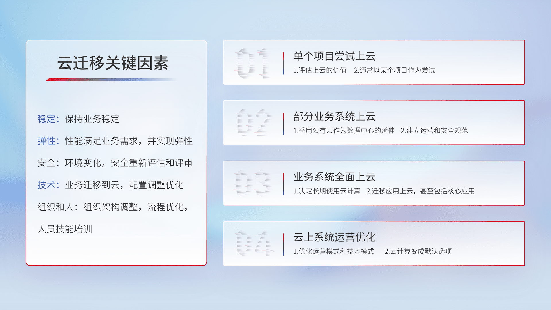 结合实际业务,,从规划设计、、、、云平台选型、、、云原生改造、、、、数据迁移、、集成交付,,迁移全过程为客户识别最佳上云路径,,,,做好风险识别管理,,,,设计网络架构、、、、身份权限、、、、安全审计合规、、、、操作审计、、、、日志审计、、监控告警策略、、、多站点容灾设计等,,,对云上基础设施进行整体规划,,,,提升IT治理水平,,,,以满足弹性、、、高可用、、高性能的需求。。。。
